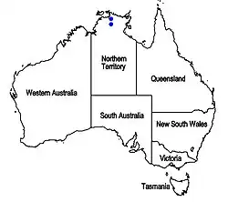This pityrodia occurs in Arnhem Land, near the East Alligator River, about 10 km (6 mi) south-west of Gunbalanya in the Kakadu National Park.[2][3]