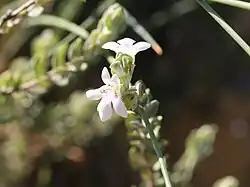 The flowers are arranged singly in upper leaf axils, crowded together so that they seem to form a spike of flowers. There is a leaf-like bract 7–10 mm (0.3–0.4 in) long and two smaller, leaf-like bracteoles 4–8 mm (0.2–0.3 in) long at the base of the flower. The five sepals are 7–10 mm (0.3–0.4 in) long and joined at the base to form a tube 1.5–3 mm (0.06–0.1 in) long. The sepals are covered with hairs similar to those on the leaves, except that the inside of the tube is glabrous. The five petals are joined to form a pale white tube 9–12 mm (0.4–0.5 in) long with five lobes on the end. The petal tube has a few soft hairs on the outside at first, but is glabrous inside apart from a densely hairy ring above the ovary and a few hairs on the largest petal lobe. The lower, middle lobe is broad elliptic to almost circular, 3–5 mm (0.1–0.2 in) broad and long while the other four lobes are smaller and roughly similar in size to each other, roughly egg-shaped and 3–5 mm (0.1–0.2 in) long. Flowering occurs from July to October and is followed by a hairy, oval fruit about 4–5 mm (0.16–0.20 in) long with the sepals attached and a network of veins on the surface.[2][3]