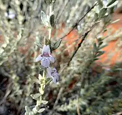 The flowers are pale whitish-pink and are usually arranged in groups of up to three on stalks 1–2 mm (0.04–0.08 in) long in upper leaf axils. The flowers are surrounded by linear to lance-shaped bracts and bracteoles which are 2–5 mm (0.08–0.2 in) long, scaly on the outside and glabrous and scale-less on the inside. The five sepals are 5–7 mm (0.2–0.3 in) long and joined for about half their length to form a tube with five lance-shaped lobes. The sepals are scaly on the outside of the tube and on the lobes but the inside of the sepal tube is glabrous. The five petals are 7–9 mm (0.3–0.4 in) long and glabrous except for a densely hairy ring around the ovary and a few long hairs on the lowest petal. The petals are joined to form a tube with five lobes in two "lips", the lower lip having three lobes. The central, lower lobe is broad elliptic to almost circular in shape, 3–4 mm (0.1–0.2 in) long and about 3 mm (0.1 in) wide and significantly larger than the other four which are about the same size as each other. Flowering occurs from May to November and is followed by hairy, oval-shaped fruit with the sepals still attached.[2][3]