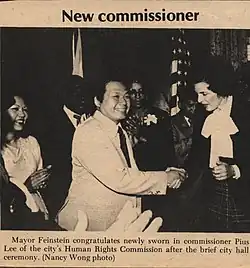 ![]() Lee shaking hands with Dianne Feinstein in the 1970s | |