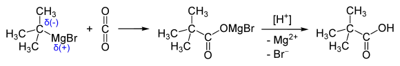An alternative oxidative route uses aqueous bromine and proceeds by oxidation of pinacolone.[3] The hydrolysis of tert-butyl cyanide has also been described.[4] Another laboratory route involves carbonation of the Grignard reagent formed from tert-butyl chloride[5]