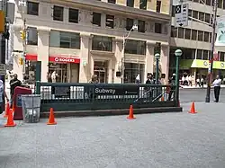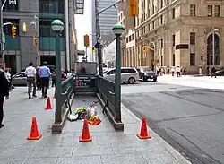 Principal photography on the film commenced in Toronto on June 2, 2014, using downtown streets decorated to resemble New York City.[32] Given sequences such as the Pac-Man chase happened at night, and the filmmakers would often close the streets off from traffic at 7:00 PM and redecorate them to resemble New York until it was dark enough, filming overnight.[33] On July 29, filming was done outside Markham, Ontario.[34] Filming was also done in the Rouge Park area, and extras were dressing in costume at Markham's Rouge Valley Mennonite Church.[34] On August 4, Gad, Dinklage and Benson were spotted in Toronto filming scenes for the film on Bay Street, which was transformed into a city block in Washington, D.C., and littered with wrecked vehicles and giant holes in the pavement.[35] The Ontario Government Buildings was doubled to transform into a federal office building in Washington. Actors were aiming at aliens, which were added later with computer-generated imagery.[35] On August 26, filming took place in Cobourg.[36] Filming was completed in three months, with twelve hours of shooting each day.[37]