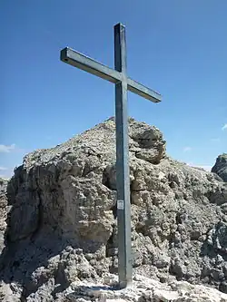 The peak of the Small Cir Italian: Piccola Cir has an elevation of 2520 meters. This peak is east of Gran Cir, close to the mountain station of the Dantercepies cable car. The top is marked with a small cross. It can be reached via a relatively easy via ferrata(B/C).[2] The path leads, secured, from the eastern side to the summit, and then unsecured on the western side down again through a gravel field.