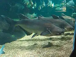 Mekong giant catfish are one of the largest species of freshwater fish. In 2005, the Mekong giant catfish attained the Guinness World Record for the world's largest freshwater fish.[4][5] Attaining a length of up to 3 m (9.8 ft), the Mekong giant catfish grows extremely quickly, reaching a mass of 150 to 200 kg (330 to 440 lb) in only six years.[3] It can reportedly weigh up to 350 kg (770 lb).[3] The largest catch recorded in Thailand since record-keeping began in 1981 was a female measuring 2.7 m (8 ft 10 in) in length and weighing 293 kg (646 lb). This specimen, caught in 2005, was widely recognized as the largest entirely freshwater fish ever caught (the largest sturgeon species, the beluga, can far exceed this size, but they are anadromous), until surpassed in June of 2022 by a giant freshwater stingray specimen caught in Cambodia.[6] Thai fisheries officials stripped the giant catfish, caught in 2005, of its eggs as part of a breeding program, intending then to release it, but the fish died in captivity and was sold as food to local villagers.[5][7][8]