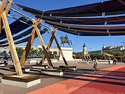 In the middle is an equestrian statue of King Louis XIV by François-Frédéric Lemot (1825).[1] Another statue, representing the Petit Prince and Antoine de Saint-Exupéry, is at the west end of the square. The square also has two pavilions, housing the tourist information office of Lyon and an art gallery.
