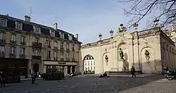 In 1877, Prosper Morey was asked to improve the square. He built a neoclassical facade on the Héré door’s west wall, surmonted with antique style « fire pots », and a fountain at the base of it.[2]