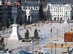 The municipal council decided on the 24th of September 1999 to completely redo the square and install a first tramway line. The development project made by the winning team of the international architecture and landscape competition of Alain Marguerit (Atelier des Paysages Alain Marguerit), Bernard Paris (Atelier d'Architecture Bernard Paris), Jean-Max Llorca (fontain engineer), LEA (Laurent Fachard, lighting technician).
