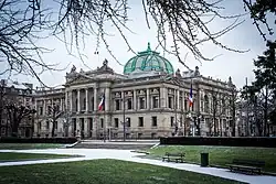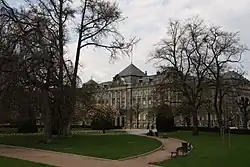 The former Imperial Palace is surrounded by its own garden, which is separated from the square by a monumental wrought iron fence. The Palace, a solemn Neorenaissance building crowned with a heavy dome, was built from 1884 until 1887 by Hermann Eggert. It is used as the seat of the Central Commission for Navigation on the Rhine since 1920 and also houses the Direction régionale des affaires culturelles (DRAC) of Grand Est.[9] It is classified as a monument historique since 1993.[10]
