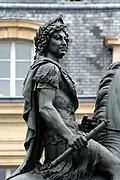 The original statue, of Louis XIV crowned by Victory and trampling Cerberus underfoot, in gilt bronze, stood on a high square pedestal with bas-relief panels and effusively flattering inscriptions; dejected bronze figures were seated at the corners. The sculptor was Martin Desjardins,[4] part of the team that was working cooperatively at the Palace of Versailles and its gardens.