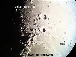 Plana is a lunar impact crater that lies on the boundary between two small lunar mare areas, with Lacus Mortis to the north and the larger Lacus Somniorum on the southern side. It was named after Italian astronomer Giovanni Antonio Amedeo Plana.[1] It is joined to the crater Mason to the east by a short stretch of rugged ground. Due north of Plana in the midst of the Lacus Mortis is the prominent crater Bürg.