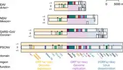 The PSCNV genome is 41.1 kilobases long, the largest known genome in an RNA virus.[2][3] It is substantially larger than coronaviruses, another group of nidoviruses known for large genomes, which are typically in the 27–32 kb range.[4] PSCNV has an unusual genomic organization consisting of a single extremely large open reading frame (ORF) which encodes a polyprotein of 13,556 amino acids – the largest protein known to be encoded by an RNA virus.[2][3]