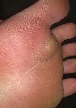 Plantar fascial fibromatosis, also known as Ledderhose's disease, Morbus Ledderhose, and plantar fibromatosis, is a relatively uncommon[2] non-malignant thickening of the feet's deep connective tissue, or fascia. In the beginning, where nodules start growing in the fascia of the foot, the disease is minor. Over time, walking becomes painful. The disease is named after Georg Ledderhose, a German surgeon who described the condition for the first time in 1894.[3][4] A similar disease is Dupuytren's disease, which affects the hand and causes bent hand or fingers.