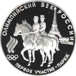 Reverse: two horse riders – Russian participants of the II Olympic Games, right – the Eiffel Tower, left – the emblem of the Russian Olympic Committee, around: "OLYMPIC AGE OF RUSSIA, FIRST PARTICIPANCE · PARIS" Design: A.V. Baklanov (obverse), N.A. Nosov (reverse) Mint: Leningrad Mint (LMD). 134 indents on the rim.[4] |