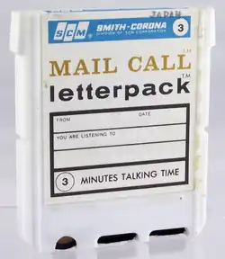 In 1967, Smith Corona (SCM) used the PlayTape cartridge format for the Mail Call,[10] a device which contained the PlayTape drive. Its design resembled a telephone and used blank tape PlayTape cartridges, offered with capacities of 3, 6 and 10 minutes of recording time, to be sent as voice letters with inexpensive shipping cost. The ends of the tape loop were fixed by an adhesive tape with a conductive top to prevent overwriting the same recording.