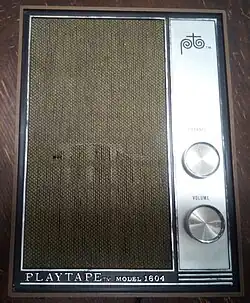 PlayTape is a 18 inch (3.2 mm)[2] audiotape format and mono or stereo playback system introduced in 1966 by Frank Stanton.[3] It is a two-track system, and was launched to compete with existing 4-track cartridge technology. The tape cartridges play anywhere from eight to 24 minutes, and are continuous. Because of its portability, PlayTape was an almost instant success, and over 3,000 artists had published in this format by 1968. White cases usually meant about eight songs were on the tape.[4][5]