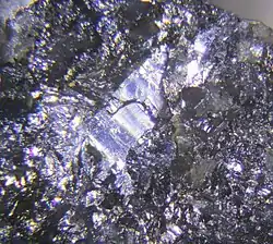 Playfairite is a rare sulfosalt mineral with chemical formula Pb16Sb18S43 in the monoclinic crystal system,[3][4] named after the Scottish scientist and mathematician John Playfair.[5] It was discovered in 1966 by the Canadian mineralogist John Leslie Jambor.[2][6][7] Lead gray to black in color, its luster is metallic. Playfairite shows strong reflection pleochroism from white to brownish gray. Playfairite has a hardness of 3.5 to 4 on Mohs scale and a specific gravity of approximately 5.72.[3]