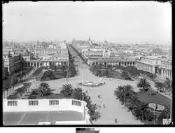 Surrounding the square are the Gateway of the Citadel and the beginning of the Peatonal Sarandí pedestrian street to the west, and the Palacio Salvo to the east.[8] Also on the east is the beginning of 18 de Julio Avenue, the most important road in the city.[9] To the south west is the Solís Theatre, while the Executive Tower and the Estévez Palace, both seats of the Executive Branch, are to the south, and the Radisson Montevideo Victoria Plaza is to the north.[10]