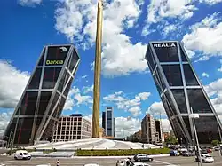 The Puerta de Europa Towers are situated at the north end of the Plaza. Erected directly in the center of the roundabout, the maligned Caja Madrid Obelisk (best known as the Calatrava's Obelisk) was inaugurated in 2009.[2] A monument to José Calvo Sotelo lies on the southern end of the Plaza de Castilla.[3]