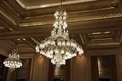 The current ballroom on floor 1 is at the center of that story.[105][68] It was initially designed by Warren and Wetmore, and had a capacity of 800 people for dinners and 1,000 people for dances.[28][52] The room contained a coved ceiling designed by Smeraldi, with crosses, hexagons, and octagons, as well as six chandeliers. The ballroom had a stage on its western wall, within a rectangular opening. A balcony ran across the three other walls and was supported by pilasters with bronze capitals.[106]
