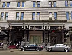 The first and second stories of the facade, respectively corresponding to the ground floor and floor 1 of the interior,[b] are clad with rusticated blocks of marble. The third story, corresponding to floor 2 of the interior, contains a smooth marble surface.[29] The hotel had two guest entrances in the 1907 design: the main entrance on Central Park South and a private entrance for long-term residents on 58th Street.[30][31] The main entrance, in the center of the Central Park South facade, contains a porch above the three center bays, and large doorways.[31][32] Since the hotel's 2008 renovation, the Central Park South entrance has served as the entrance to the building's condominiums.[33]