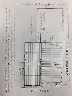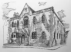 The church building opened for a Baptist congregation in 1811.[30] As constructed, the Arthur Street building was, in Roy Pinkerton's words, "a rather plain, piend-roofed rectangle". It included an adjoining tenement and halls. In 1836, the congregation added galleries, increasing the church's capacity from 700 to 1,000.[31]
