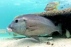 Plectorhinchus caeruleonothus adults are mostly silvery-grey in colour, but the cheek and the operculum are uniformly bluish-grey. The orbit of the eye and upper edge of the upper jaw are sooty yellow, while the posterior edge of the gill membrane is silvery-grey. The juveniles are blackish brown and marked with 10 uneven, horizontal, slender white stripes on the head and body. The caudal fin is marked with diagonal white bars that converge on the central margin, while the pectoral fins are yellow with a dark brown blotch in the middle of their inner bases.[1] The dorsal fin contains 12 spines and 18-20 soft rays, while the anal fin has 3 spines and 6-7 soft rays. This species attains a maximum total length of 100 cm (39 in).[2]
