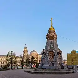 The Plevna Chapel is a public subscription monument to the Russian Grenadiers who died during the Siege of Plevna. It was opened on a square outside the Ilyinka Gate of the Walled City in Moscow on the 10th anniversary of the taking of Pleven (1887), in the presence of Field Marshal Nikolai Nikolayevich.[1] The monument was designed by Vladimir Sherwood. Each side is decorated with a high relief plaque illustrating the exploits of the Grenadiers. The interior, now empty, once housed a set of bronze plaques listing 18 Grenadier officers and 542 soldiers who died at Plevna. An annual memorial service is held in front of the chapel on March 3 (the day of Bulgaria's liberation). In the Perestroika years, the surrounding park used to be notorious as a gay cruising ground.[2]