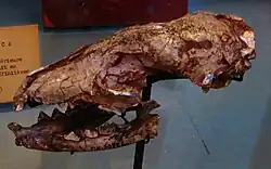 Plioviverrops is an extinct genus of hyaenids that were native to Europe throughout the Miocene and Early Pliocene. Plioviverrops is unique among most hyaenids in its gradual development towards more hypocarnivorous dentition as opposed to most hyaenids which evolved to have hypercarnivorous dentition.[1][2] As P. orbignyi had especially reduced and simplified dentition, it has been proposed that P. orbignyi may be ancestral to the genus Proteles, including the modern aardwolf.[2] Plioviverrops may be a paraphyletic group.[1]