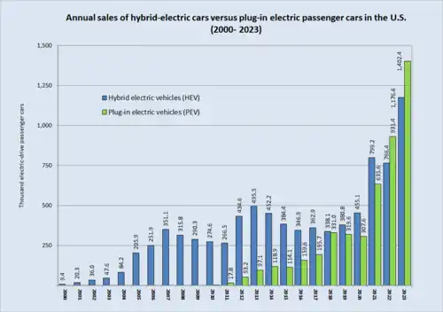 Sales figures sourced from HybridCars.com up to 2017 and direct reports submitted by EDTA member companies - ^ Office of Energy Efficiency and Renewable Energy (28 February 2022). "FOTW #1227, February 28, 2022: Light-Duty Plug-in Electric Vehicle Sales in the United States Nearly Doubled from 2020 to 2021". U.S. Department of Energy. Retrieved 4 March 2022. Download file at the link "Fact #1227 Dataset"