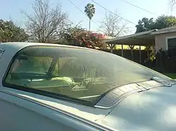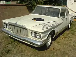 The Valiant was less radical in configuration than General Motors' compact Chevrolet Corvair, which had an air-cooled rear-mounted engine, but was considered more aesthetically daring than the also-new Falcon and Studebaker Lark compacts, which had more conventional looks; the Valiant boasted a radical design that continued Exner's "Forward Look" styling with "sleek, crisp lines which flow forward in a dart or wedge shape".[7] The flush-sided appearance was a carried-over feature from Chrysler's Ghia-built D'Elegance and Adventure concept cars which also gave the Valiant additional inches of interior room.[7] The Valiant's styling was new, yet with specific design elements that tied it to other contemporary Chrysler products, such as the canted tailfins tipped with cat's-eye shaped tail lamps and the simulated Continental spare tire pressed into the trunk lid that were thematically similar to those on the Imperial and the 300F. According to Exner, the stamped wheel design was used not only to establish identity with other Chryslers, but to "dress up the rear deck area without detracting from the look of directed forward motion".[7]