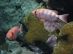 | Pair of Priacanthus hamrur above coral with patches of Pneophyllum conicum at Marsa Shouna, Red Sea, Egypt | |