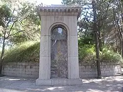 In 846, Bai Juyi died, leaving instructions for a simple burial in a grave at the monastery, with a plain style funeral, and to not have a posthumous title conferred upon him.[16] He has a tomb monument in Longmen, situated on Xiangshan across the Yi River from the Longmen cave temples in the vicinity of Luoyang, Henan. It is a circular mound of earth 4 metres (13 ft) high and 52 metres (171 ft) in circumference, with a 2.8-metre (9 ft 2 in) tall monument inscribed "Bai Juyi".