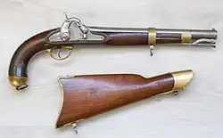 During the Indian Wars of the mid 19th century, the American army issued a horse pistol to the cavalry with a detachable buttstock.[6] By attaching the stock, the Springfield Model 1855 pistol could be converted into a carbine with superior range and accuracy when skirmishing on foot.[7][8]