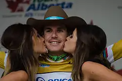 Podium girls kissing stage and general classification winner Daryl Impey at the 2014 Tour of Alberta