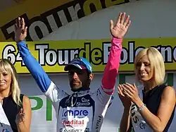 Podium girls, formally known as "tour hostesses" (French: hôtesses du Tour), are women who are best known for presenting prizes and kisses to the winners of the Tour de France and other major cycle races, including the Giro d'Italia and Vuelta a España. In the Tour de France, a team of four podium girls is employed by the race's main sponsor, the French bank LCL S.A.[1] They are responsible for entertaining clients of the sponsors before the morning departure of the race and in parties after the end of the race, but their most visible and prestigious role is in the award ceremony at the close of each day's racing. The job requires working long hours in all weather conditions but is well-paid and sought-after, with candidates selected on the basis of their looks, endurance, personalities, and linguistic abilities. Although they are forbidden to interact with the riders, other than kissing them in the award ceremonies, several podium girls have ended up marrying cyclists.