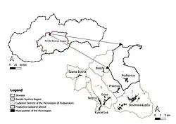 Podkonice is part of a group of mountainous type villages in the Banská Bystrica region. The village is located at the foot of the southern slopes of the Low Tatras at an altitude of 520 meters above sea level. It belongs to the Banská Bystrica District and is also part of the Central Slovak mountain region of folk culture. In March 2000, the village became a member of the "Microregion pod Panský dielom". The bordering municipalities of Baláže, Kynceľová, Nemce, Podkonice, Priechod, Selce, Slovenská Ľupča, and Špania Dolina are the other members of the microregion. The total area of this microregion is 110 km2, it lies in the altitude range of 360 - 1250 m above sea level, and its member villages are home to approximately 8250 inhabitants.[5] The common goal of the microregion's municipalities is partnership and cooperation in the field of tourism, solving issues of employment, and civic amenities, solving environmental problems and preserving folk and local traditions.[6]