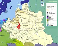 Podlachia is a multicultural and multi-religious region. It is the region where people's identity has been shaped throughout history by both the Orthodox and Roman Catholic churches, and since the Reformation, also by Evangelical churches. Until today, Podlachia has been considered Poland's most culturally diverse region.[5] Throughout its early history, Podlachia was inhabited by various tribes of different ethnic roots. According to various sources, East Slavic tribes settled either in the 9th and 10th centuries (mostly Drevlians, with Dregoviches in the north and likely Dulebes in the south),[3] or in the 11th and 12th centuries in the eastern and southern part.[6] The Polish Masovians[7] settled before the 11th century in the western part, as evidenced by Masovian-type strongholds from that period.[6] In the 12th century, the northern part was settled by the Yotvingians, and afterwards the region was devastated by Yotvingian and Lithuanian raids.[8] In the 13th century, the Yotvingians were driven out of Podlachia by Bolesław V the Chaste and Leszek II the Black, and the region was repopulated by Poles from Masovia, including minor nobility.[9] Since the 13th century, Podlachia was contested by Poland and Lithuania, with varying ownership.[9] In 1253 Pope Innocent IV recognized Polish sovereignty over Podlachia.[9] In the 14th century, Polish King Casimir III the Great granted the southern part to Lithuania.[9] In 1379, the Teutonic Knights ravaged the region and unsuccessfully besieged Mielnik and Brześć.[10]