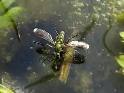 When the Culex larvae break the water's surface to get air, the P. nobilitatus will attack with its mouth. [8] After a short struggle the larvae will be carried on the wing of the fly and put into the mud where the fly will eat it.