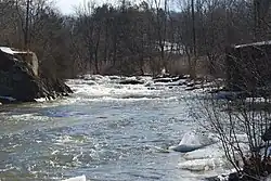 In the 1800s, many mills and factories were built along this river to use waterpower or have easy access to the Hudson on a riverside road beginning just after Poesten Kill Falls.[22] This included a bridge that spanned the creek just after the falls, and this bridge is no longer around but remains of the old factories still can be seen along the north side of the river. Small dirt paths are all that is left of the roads on the north side of the creek between the falls and Prospect Park.