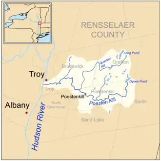 The Poesten Kill is a 26.2-mile-long (42.2 km)[1] creek in Rensselaer County, Upstate New York. It flows westerly from its source at Dyken Pond, located in the town of Berlin, to its mouth at the Hudson River in the city of Troy. The creek was historically used as a source of water for the local farmers and residents. During the Industrial Revolution, the creek became an important source of water power, and many mills and factories sprung up along its banks.[2]