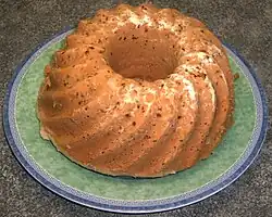 Poffert (Dutch: [ˈpɔfərt] ⓘ; Gronings: povvert), also known as trommelkoek or ketelkoek is a dish from the province of Groningen in the Netherlands.[1] It is traditionally made with wheat flour, buckwheat flour, yeast, currants, raisins, milk, eggs, and salt. The batter is cooked au bain-marie (a water bath) in a special tin.
