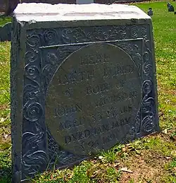 Elizabeth Elatson (d. 1704–05), a house fire victim, is buried there. The report in The Boston News-Letter was the first published account of a house fire in America.[E]