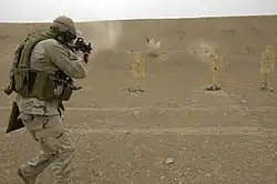 Point shooting (also known as target-[1] or threat-focused shooting,[2] intuitive shooting, instinctive shooting, subconscious tactical shooting, or hipfiring) is a practical shooting method where the shooter points a ranged weapon (typically a repeating firearm) at a target without relying on the use of sights to aim. Emphasis is placed on fast draw and trying to score preemptive hits first.[1] In close quarters combat, where life-threatening situations emerge very quickly, sighted marksmanship techniques become risky,[3] so advocates of point shooting emphasize a less sighting-oriented style that prioritizes the tactical advantages of quick fire superiority and suppression.
