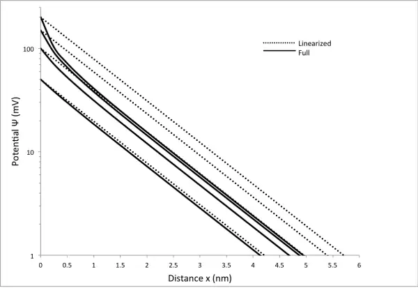 In low potential cases, the high potential equation may be used and will still yield accurate results. As the potential rises, the low potential, linear case overestimates the potential as a function of distance from the surface. This overestimation is visible at distances less than half the Debye length, where the decay is steeper than exponential decay. The following figure employs the linearized equation and the high potential graphing equation derived above. It is a potential-versus-distance graph for varying surface potentials of 50, 100, 150, and 200 mV. The equations employed in this figure assume an 80mM NaCl solution.