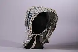 This prominent brim shaded the face and, over time increased in size so that the wearer's face could only be seen from the front.[5] Typically, the bonnet would be secured by ribbons tied under the chin, which might also wrap around the bottom of the bonnet's crown, similar to a hatband. An 1830s version of the poke bonnet with ornate ribbon wrapping forms part of the Victoria and Albert Museum archive.[6]
