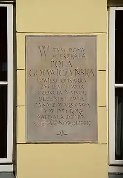 Pola Gojawiczyńska was one of the most popular women writers of the Polish literature of interwar period. Her works included psychological themes and social themes connected with proletarian and small town environment of Warsaw and Silesia. Her works Dziewczęta z Nowolipek (Girls from Nowolipki) and Rajska jabłoń (Heavenly Apple tree) were later filmed.