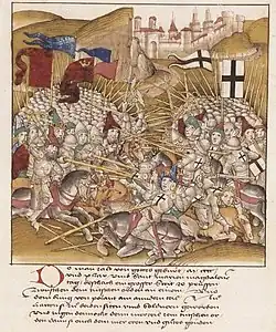 In the Baltic Sea region, the struggle of Poland and Lithuania with the Teutonic Knights continued and culminated at the Battle of Grunwald in 1410, where a combined Polish-Lithuanian army inflicted a decisive victory against them.[75] In 1466, after the Thirteen Years' War, king Casimir IV Jagiellon gave royal consent to the Peace of Thorn, which created the future Duchy of Prussia under Polish suzerainty and forced the Prussian rulers to pay tributes.[30] The Jagiellonian dynasty also established dynastic control over the kingdoms of Bohemia (1471 onwards) and Hungary.[76] In the south, Poland confronted the Ottoman Empire (at the Varna Crusade) and the Crimean Tatars, and in the east helped Lithuania to combat Russia.[30]