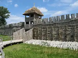 The period spanning the Bronze Age and the Early Iron Age (1300 BC–500 BC) was marked by an increase in population density, establishment of palisaded settlements (gords) and the expansion of Lusatian culture.[38][39] A significant archaeological find from the protohistory of Poland is a fortified settlement at Biskupin, attributed to the Lusatian culture of the Late Bronze Age (mid-8th century BC).[40]