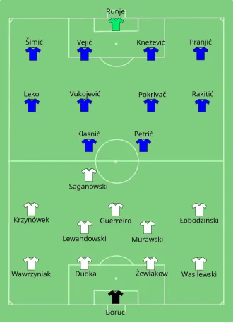 The Polish team lined up in a 4–5–1 formation. The central defenders, Dariusz Dudka and Michał Żewłakow, were supported by two defensive midfielders, Mariusz Lewandowski and Rafał Murawski. The full-backs were instructed to join the attack frequently, and Marek Saganowski was supported by Roger.[70] However, this plan did not succeed, as the opponents dominated the midfield and dictated the game's pace. At halftime, Adam Kokoszka replaced Mariusz Lewandowski, moving Dudka into midfield.[70] Poland continued with a single striker; later, Euzebiusz Smolarek replaced Wojciech Łobodziński, and Tomasz Zahorski came on as well, moving Smolarek to the attack and Zahorski to the right wing.[70]