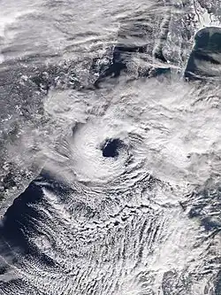 A polar low is a mesoscale, short-lived atmospheric low pressure system (depression) that is found over the ocean areas poleward of the main polar front in both the Northern and Southern Hemispheres, as well as the Sea of Japan.[1] The systems usually have a horizontal length scale of less than 1,000 kilometres (620 mi) and exist for no more than a couple of days. They are part of the larger class of mesoscale weather systems. Polar lows can be difficult to detect using conventional weather reports and are a hazard to high-latitude operations, such as shipping and gas and oil platforms. Polar lows have been referred to by many other terms, such as polar mesoscale vortex, Arctic hurricane, Arctic low, and cold air depression. Today the term is usually reserved for the more vigorous systems that have near-surface winds of at least 17 m/s (38 mph).[2]
